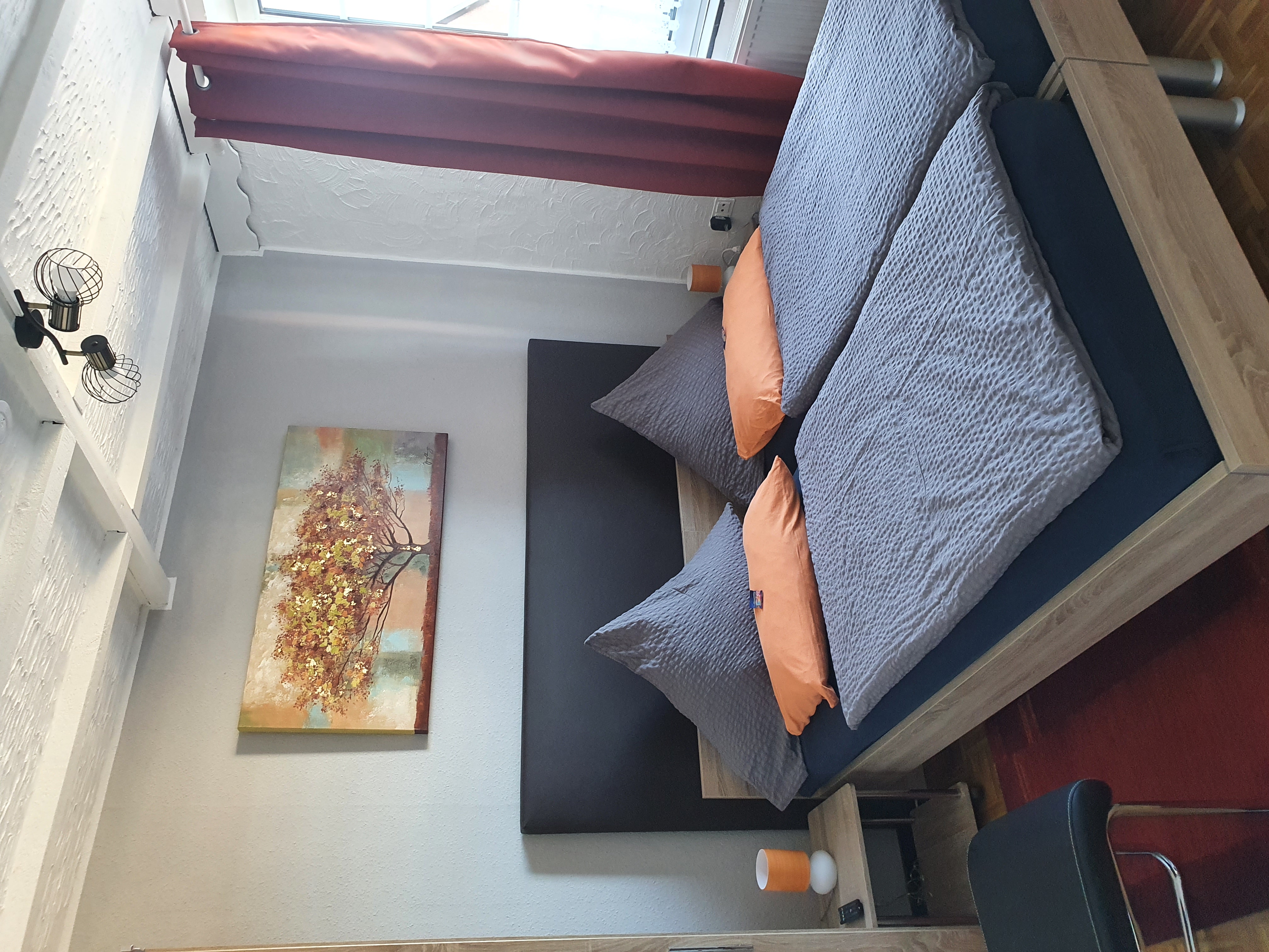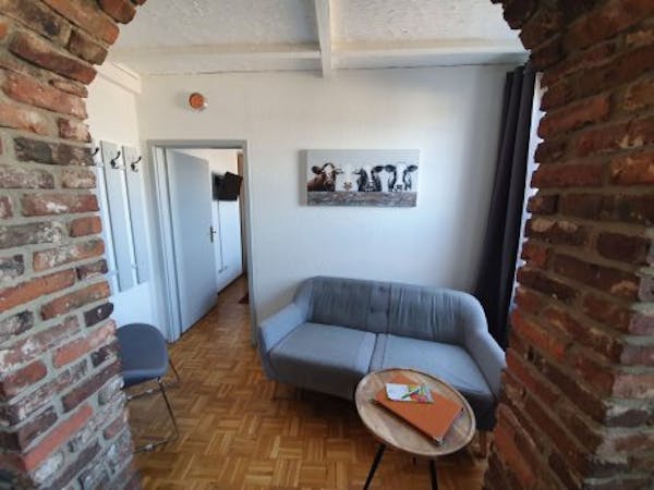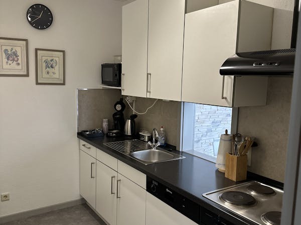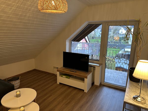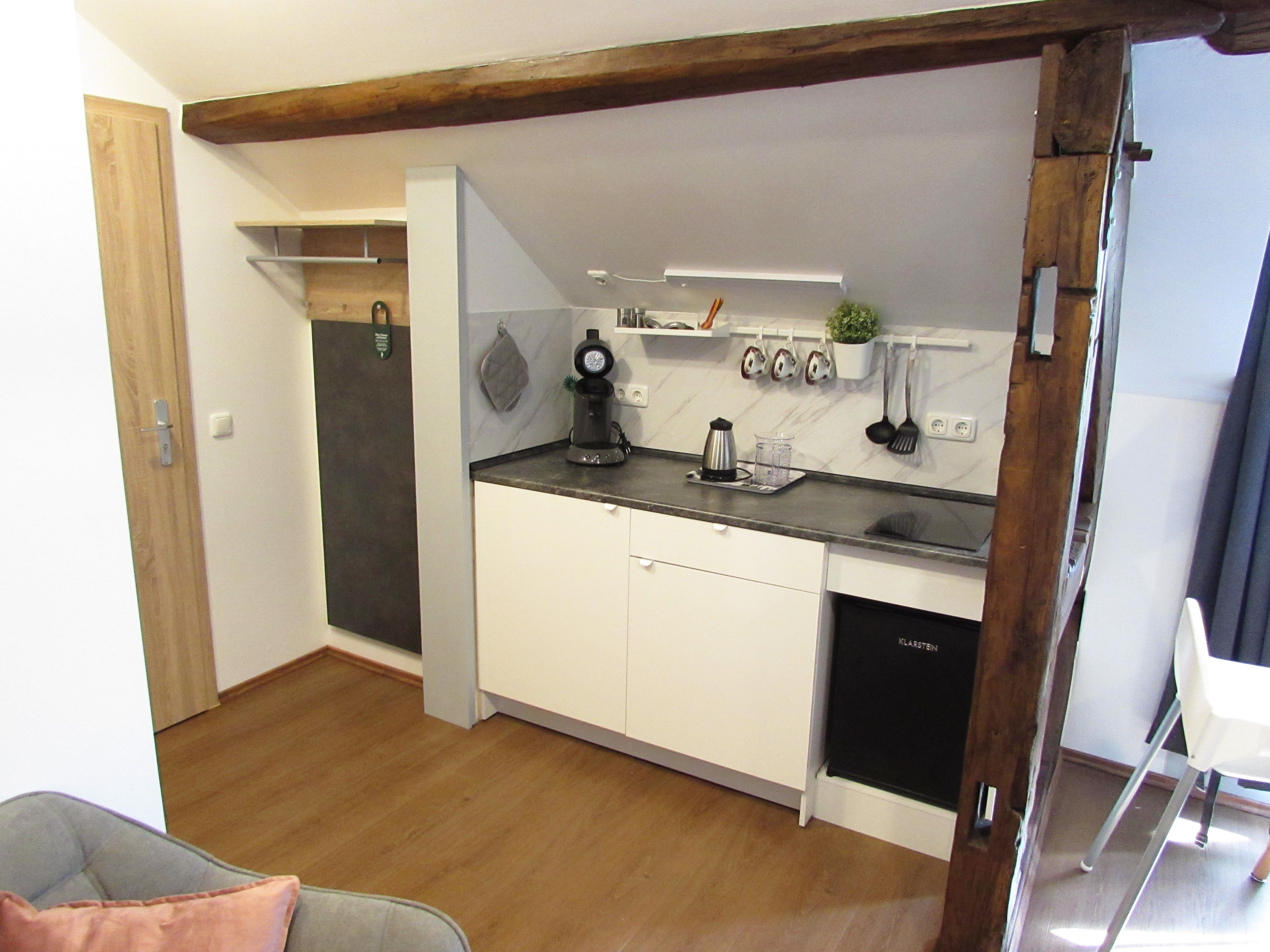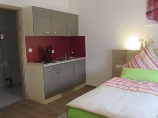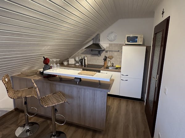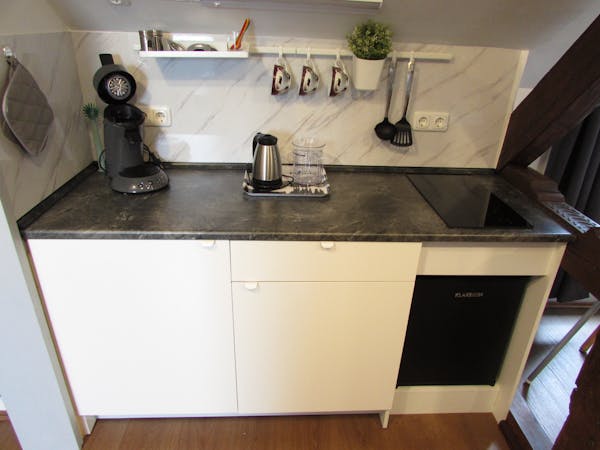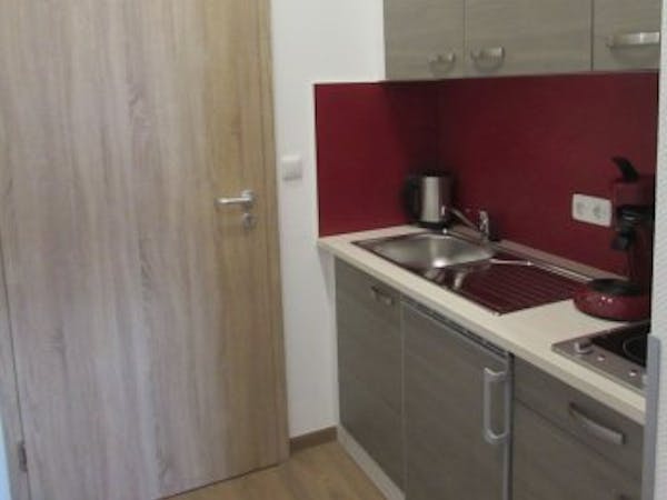 In addition to the spacious living and sleeping area, the apartment has a small kitchenette (equipped with everything you need), a bright bathroom with a large shower, and a small balcony with a view of the forest, which invites you to linger on a warm summer evening. Please note: the studio is on the 3rd floor, without a lift!