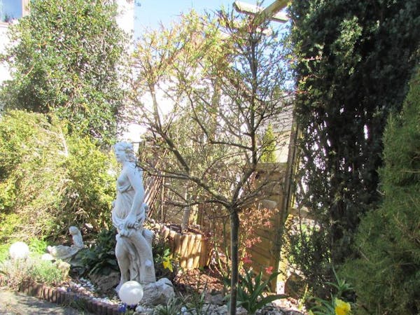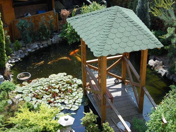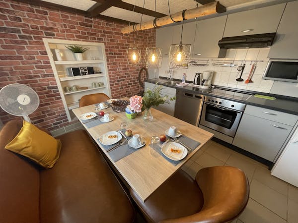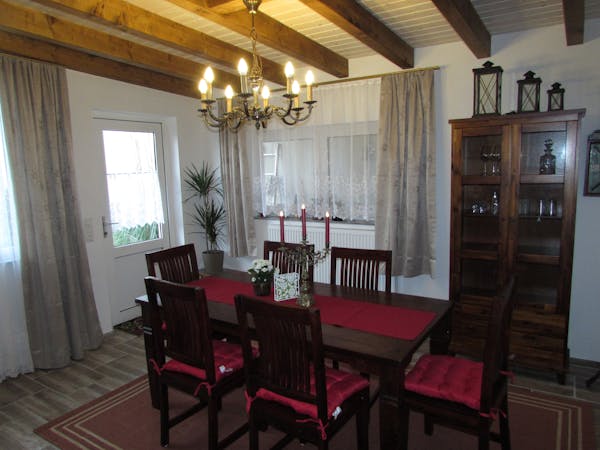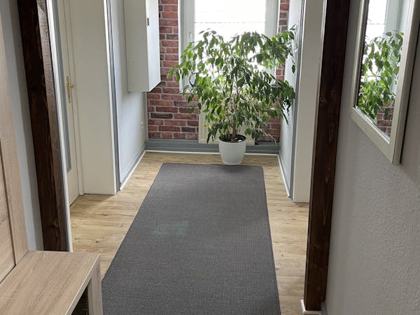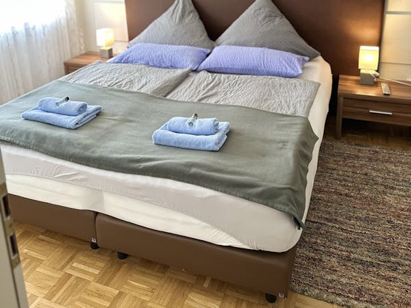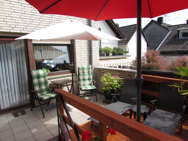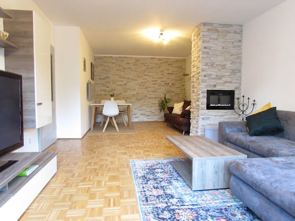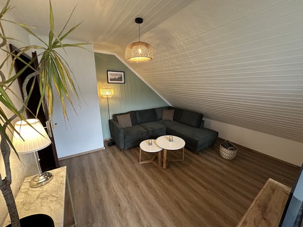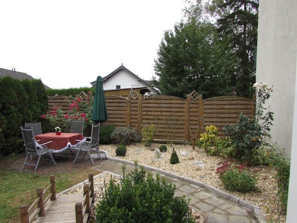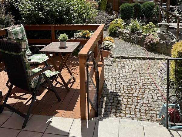 The "Apartment with Terrace" on the ground floor was newly renovated and modernized in autumn 2020. The apartment has a bedroom with a double bed, shower bath (with washing machine and hairdryer), and a fully equipped kitchen the highlight is the large & bright living-dining area with access to the terrace and garden with koi pond. During the warm season, the terrace invites you to relax on sun loungers.