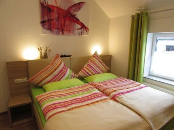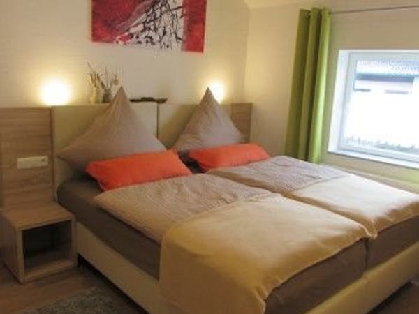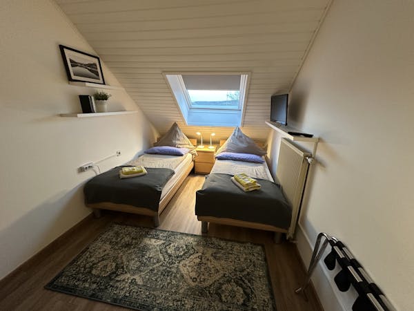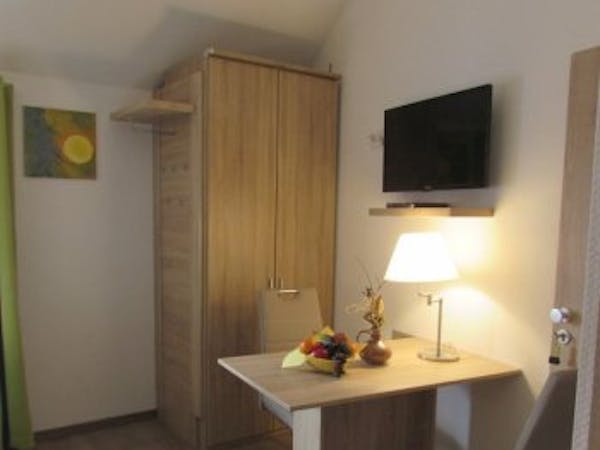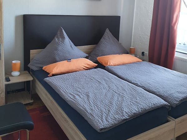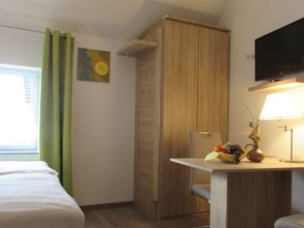 Our single rooms on the first floor are new and modern and have their own bathroom with shower and toilet. The equipment includes box spring beds, additional blankets, and pillows, satellite TV, WLAN Internet access, a hair dryer, bathroom towel dryer, refrigerator, coffee pad machine, and kettle.