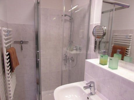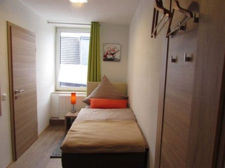 Our single rooms on the first floor are new and modern and have their own bathroom with shower and toilet. The equipment includes box spring beds, additional blankets, and pillows, satellite TV, WLAN Internet access, a hair dryer, bathroom towel dryer, refrigerator, coffee pad machine, and kettle.